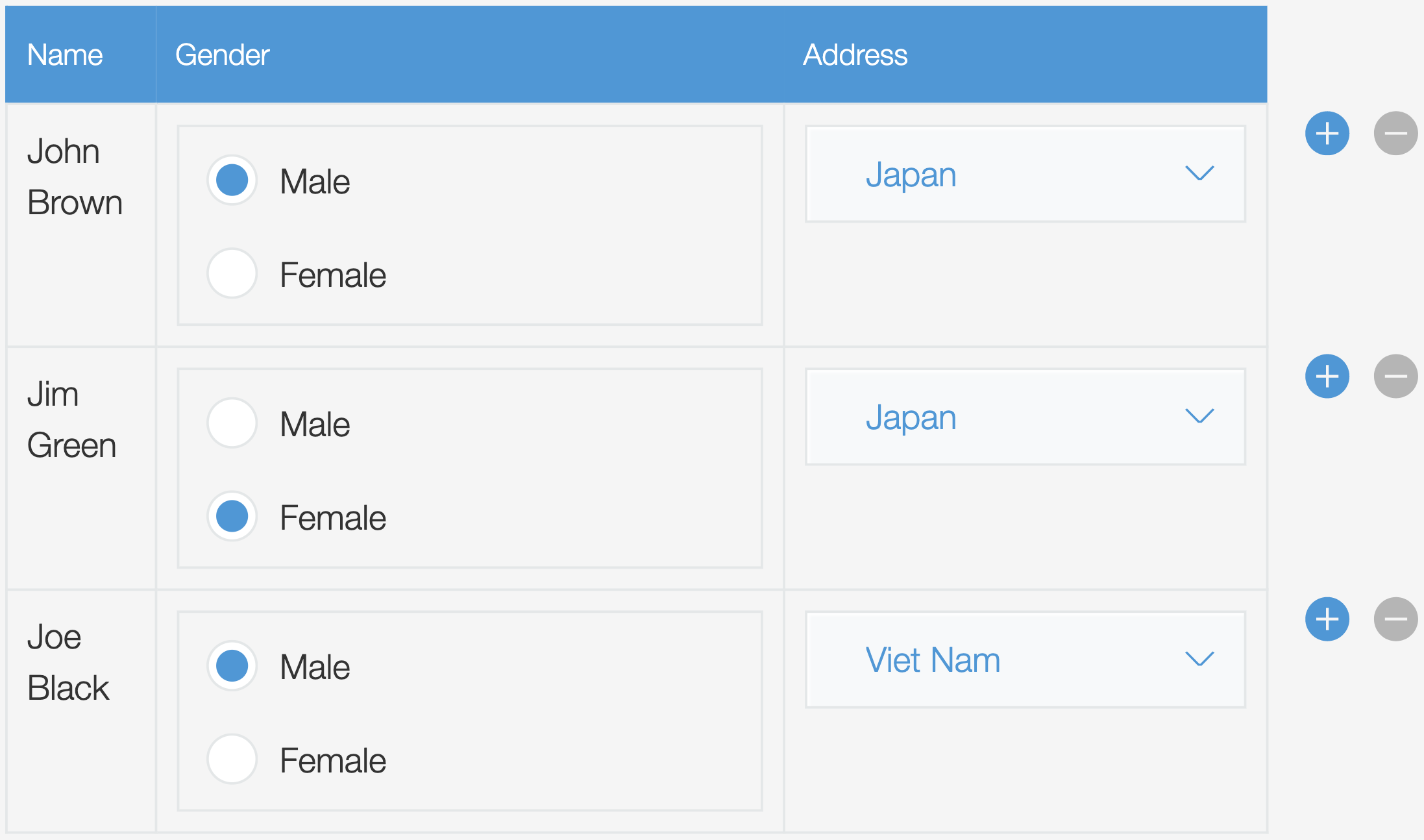 In contrast, the Table component allows the user to manipulate the components displayed in the table cell such as changing data and adding and deleting rows.